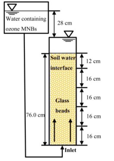 在內(nèi)徑為12 cm 的有機(jī)玻璃圓筒(圖1)中進(jìn)行了柱測試, 以研究臭氧MNB處理受有機(jī)物污染的地下水。將玻璃珠與甲基橙溶液以10 mg / L的初始濃度混合,以模擬被有機(jī)物污染的土壤和地下水。的比重的玻璃珠是2.43,平均直徑為60微米,干密度為1.43 克/厘米3 。的水力傳導(dǎo)率為1.3 × 10 -4米/秒,因?yàn)椴Aе檫M(jìn)行分級(jí)很差,其表示介質(zhì)的沙子。土壤樣品的高度為76 分別在距底部16 厘米,32 厘米,48 厘米和64 厘米處分布有4個(gè)采樣口#1,#2,#3和#4 。去離子水中不斷產(chǎn)生臭氧MNB,以確保臭氧MNB的數(shù)量保持在峰值。含有臭氧的MNB的水從底部以0.368 的水力梯度i向上供入塔中。不使用MNB的去離子水用于對(duì)比測試。每個(gè)測試進(jìn)行兩次以確保數(shù)據(jù)的可重復(fù)性。