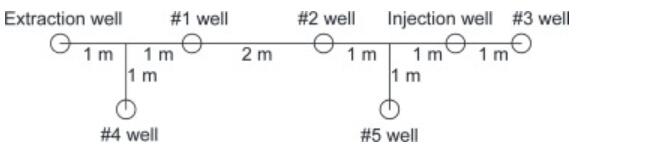 一臺(tái)抽采井,一臺(tái)注入井和五個(gè)監(jiān)控井(其位置如圖2所示)用于原位修復(fù)。 很初的地下水流向是從注入井到提取井。每個(gè)井的深度為16 m,篩選間隔為12 m至16 m。提取井的直徑為25 cm,將提取速率為36 L / min 的泵放置在井內(nèi)15 m 的深度處。注入井和監(jiān)測井的直徑為5 厘米。注入井與注入單元相連,注入率為15 升/分鐘 由于注入速率受場地和設(shè)施條件的限制,因此采用了較高的抽取速率以產(chǎn)生更強(qiáng)的地下水流。處理殘留的水并將其排放到遠(yuǎn)離測試區(qū)域的地方。在監(jiān)測井中安裝了地下水采樣器,以收集15 m 深度的樣品。