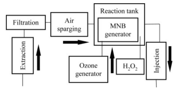 開發(fā)了現(xiàn)場修復(fù)設(shè)備(圖3 )用于現(xiàn)場測試。修復(fù)系統(tǒng)包含三個(gè)部分:提取單元,反應(yīng)單元和注射單元。從該地點(diǎn)提取受污染的地下水,并進(jìn)行過濾以除去土壤顆粒。過濾后,用空氣噴射裝置處理地下水以除去三氯乙烯。隨后,將處理過的地下水注入到反應(yīng)罐中。MNB發(fā)生器位于水箱內(nèi)部,用于原位產(chǎn)生臭氧MNB。在產(chǎn)生臭氧MNB的過程中,以1∶1的臭氧∶H 2 O 2的質(zhì)量比添加H 2 O 2試劑。臭氧MNB和H 2 O之后添加2份水,通過注入單元將水注入地面。從反應(yīng)罐到進(jìn)樣單元的流量為15 L / min,停留時(shí)間為33.3 min,以實(shí)現(xiàn) 很佳的MNB生成。從當(dāng)?shù)貢r(shí)間每天09:00到18:00進(jìn)行了六天的原位地下水修復(fù)。對(duì)地下水進(jìn)行采樣以監(jiān)測三氯乙烯的濃度。