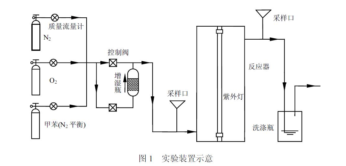 本研究選取氣態(tài)甲苯作為目標污染物,使用發(fā)射UV254nm+185nm 波長紫外光的紫外燈,處理5~20mg/m3 的氣態(tài)甲苯,考察各不同參數(shù)對連續(xù)甲苯光降解的影響.確定甲苯初始濃度、氣流流量、相對濕度、O2 含量等因素與甲苯轉(zhuǎn)化效率及轉(zhuǎn)化速率的關(guān)系;定量分析甲苯在紫外光降解過程中體系O3以及中間產(chǎn)物的產(chǎn)生,探討甲苯在UV254nm+185nm紫外光照射下的降解機理.