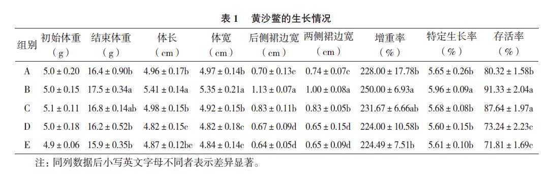 試驗(yàn)期間,每隔3 d 從池中取樣測(cè)量水質(zhì),測(cè)定其溶解氧、氨氮含量、亞硝酸鹽含量,試驗(yàn)周期為21 d。試驗(yàn)結(jié)束時(shí),統(tǒng)計(jì)各組黃沙鱉的存活數(shù)量。并隨機(jī)從水池中取出10 只黃沙鱉,測(cè)量其體重、體長(zhǎng)、體寬、裙邊寬度,其中后側(cè)裙邊寬度為背甲 很長(zhǎng)線上背甲邊到裙邊邊緣的距離;兩側(cè)裙邊寬度為背甲 很寬線上背甲邊到裙邊邊緣的距離。
