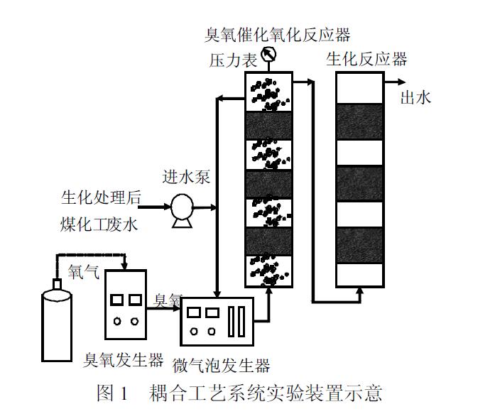本研究采用微氣泡臭氧催化氧化-生化耦合工藝,對(duì)某實(shí)際煤化工廢水生化出水進(jìn)行深度處理.水質(zhì)分析表明,該廢水生化出水存在大量含氮雜環(huán)芳烴類污染物,可生化性極差,傳統(tǒng)曝氣生物濾池(BAF)對(duì)其COD去除率僅6.4%,難以采用生化工藝直接處理.本研究采用微氣泡臭氧催化氧化含氮雜環(huán)芳烴類污染物,提高廢水可生化性并去除部分COD,而后采用生化處理進(jìn)一步去除COD 和氨氮.此外,還考察了微氣泡臭氧催化氧化-生化耦合處理去除污染物性能,并分析了處理過程中含氮雜環(huán)芳烴類污染物降解和可生化性變化,以期為該耦合工藝應(yīng)用于煤化工廢水深度處理和含氮雜環(huán)芳烴類污染物去除提供參考.
