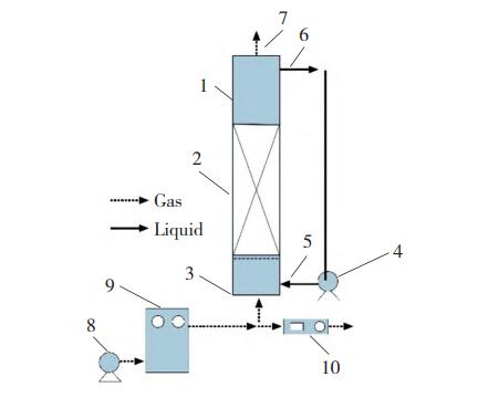 1—Catalyticdevice;2—Catalyst;3—Aerationdisk;4—Circulatingwaterpump;5—Inlet;6—Outlet;7—Exhaustgasoutlet;8—Airpump;9—Ozonegenerator;10—Ozonegasconcentrationdetector