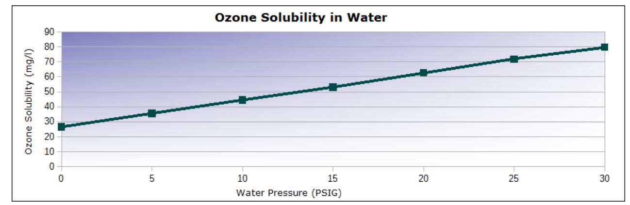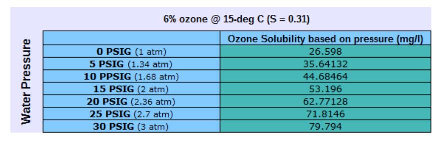 下面的圖表和表格說明了臭氧氣體在水中的溶解度,因為它與水的壓力有關(guān)。